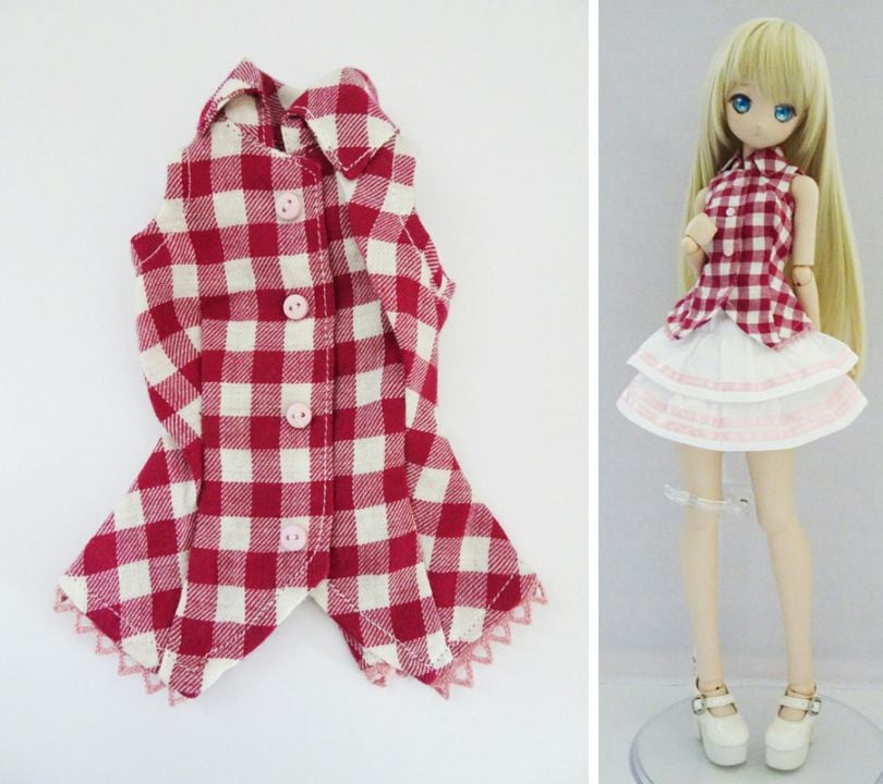 【単品】オビツ50/DDP/アゾン45 ノースリーブ燕尾ブラウス(イチゴギンガム)
