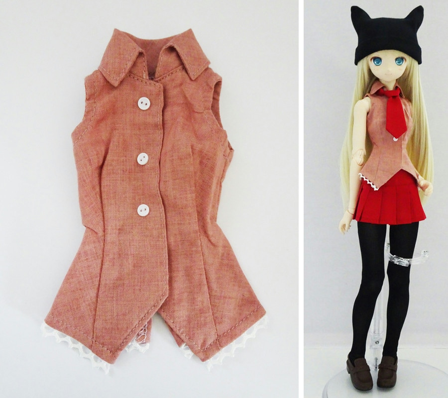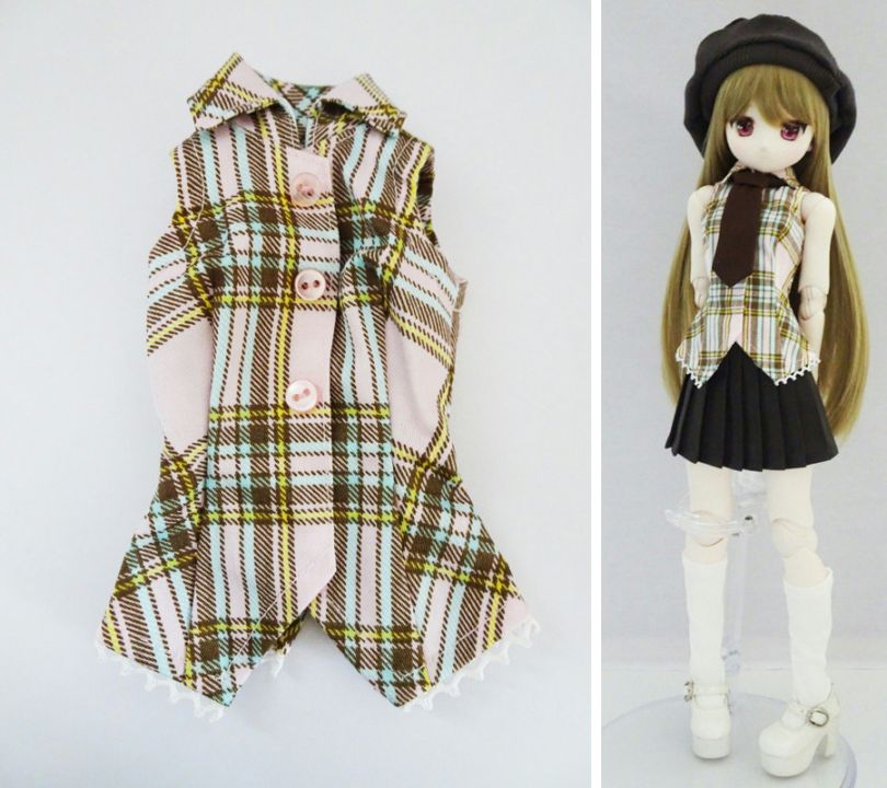 【単品】オビツ50/DDP/アゾン45 ノースリーブ燕尾ブラウス(パステルピンクチェック)