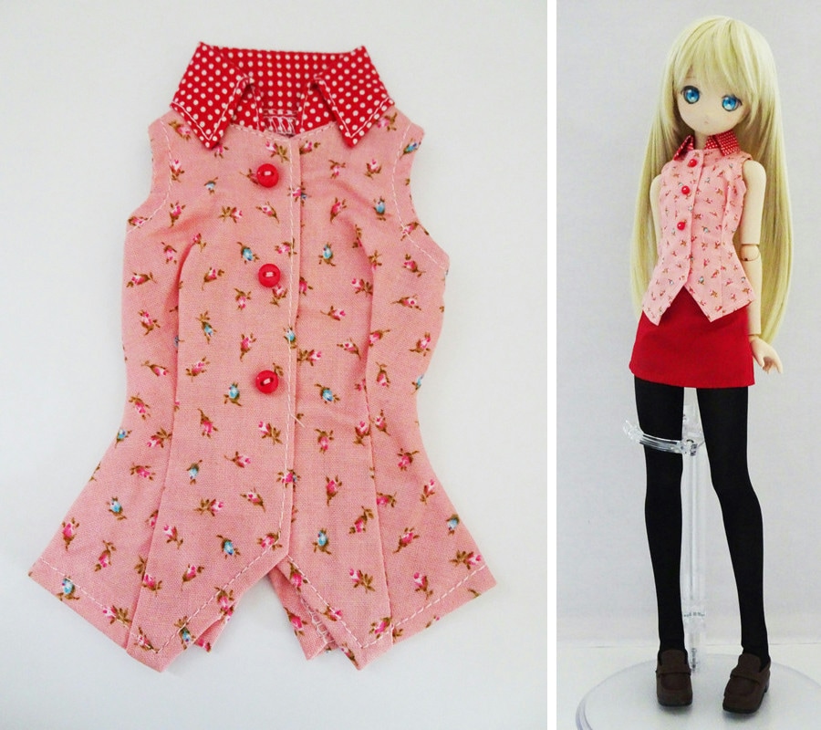 【単品】オビツ50/DDP ノースリーブ燕尾ブラウス(ピンク小花/赤ドット襟)