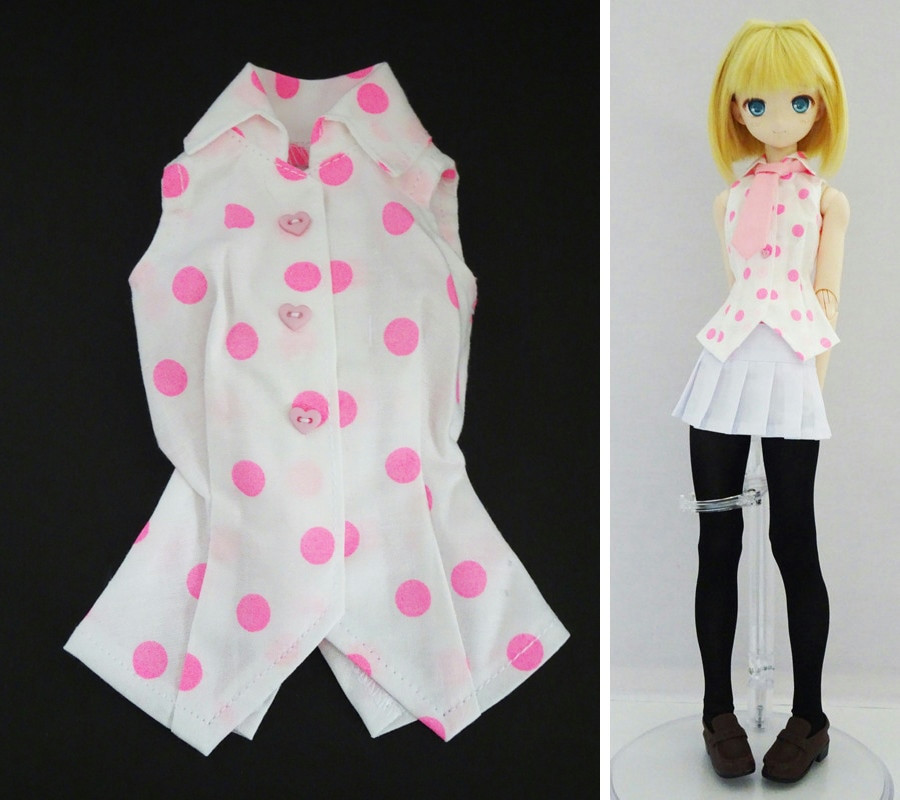 【単品】オビツ50/DDP/アゾン45 ノースリーブ燕尾ブラウス(白地蛍光ピンクドット)